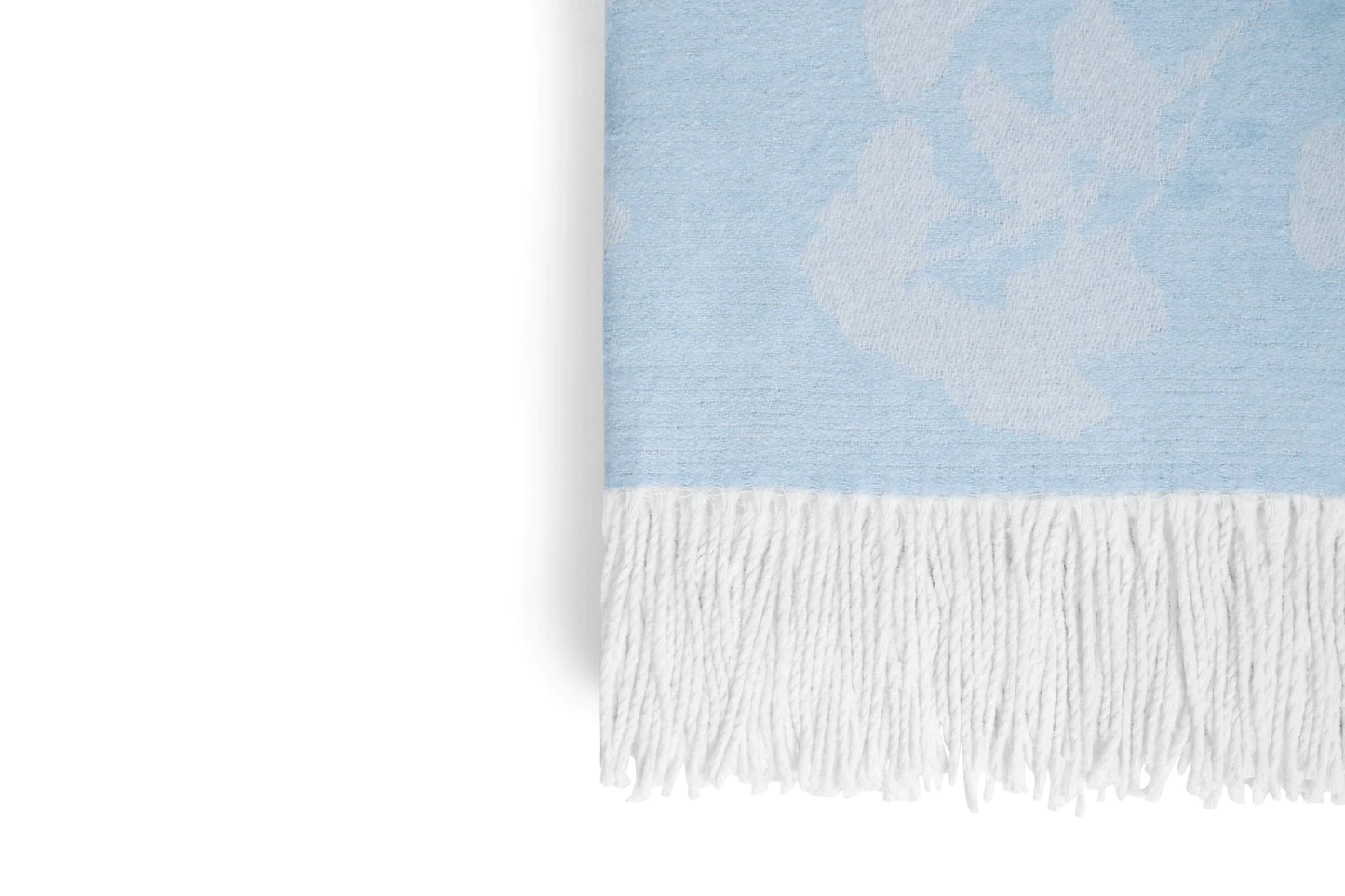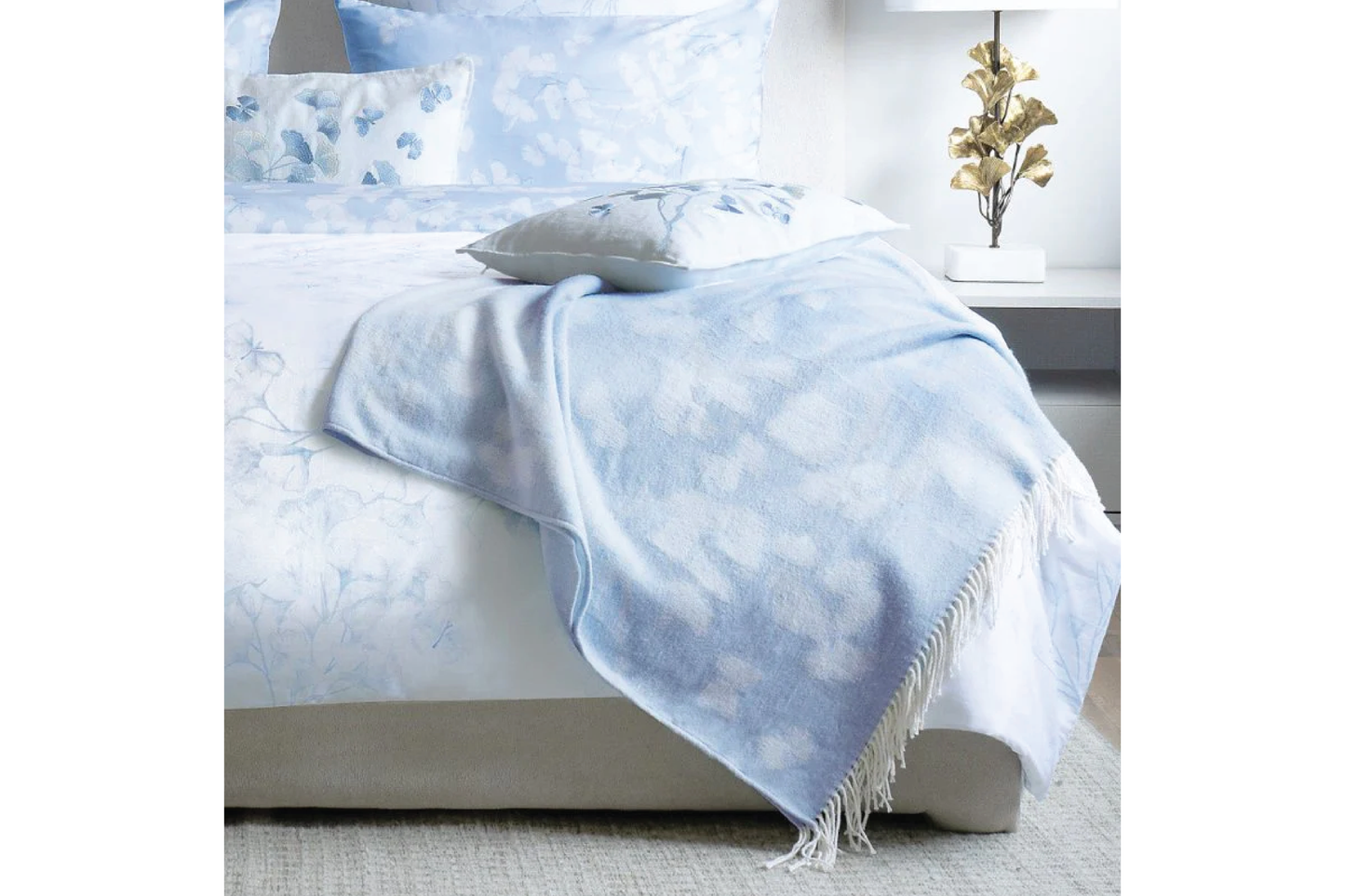 The Butterfly Ginkgo Throw in Sky and White by Michael Aram is a luxurious expression of nature’s quiet transformation. Inspired by ginkgo leaves unfurling like butterfly wings, this handcrafted textile is woven in a soft blend of fibers and finished in gentle ombré tones. Both comforting and ethereal, it is an elegant layering piece that brings refined artistry and timeless beauty to any space.