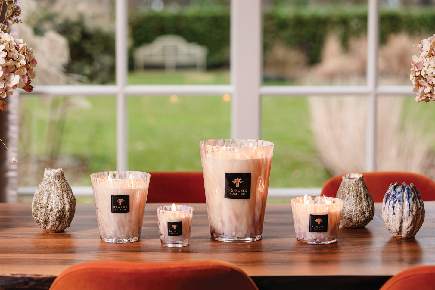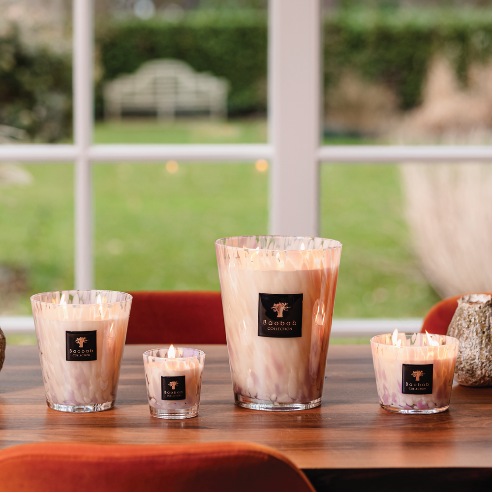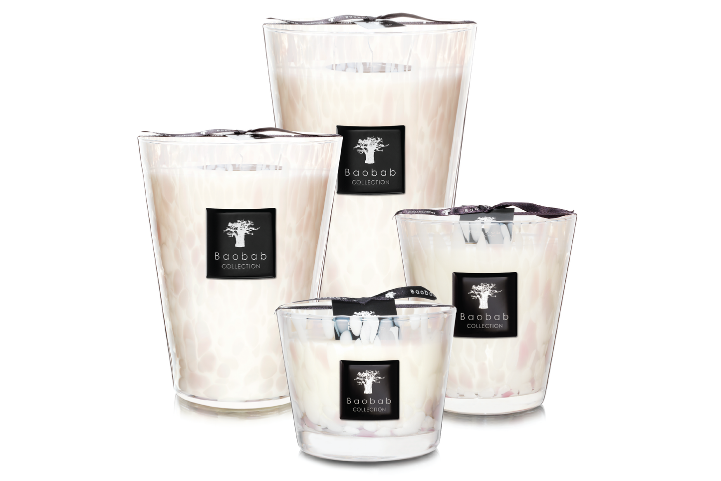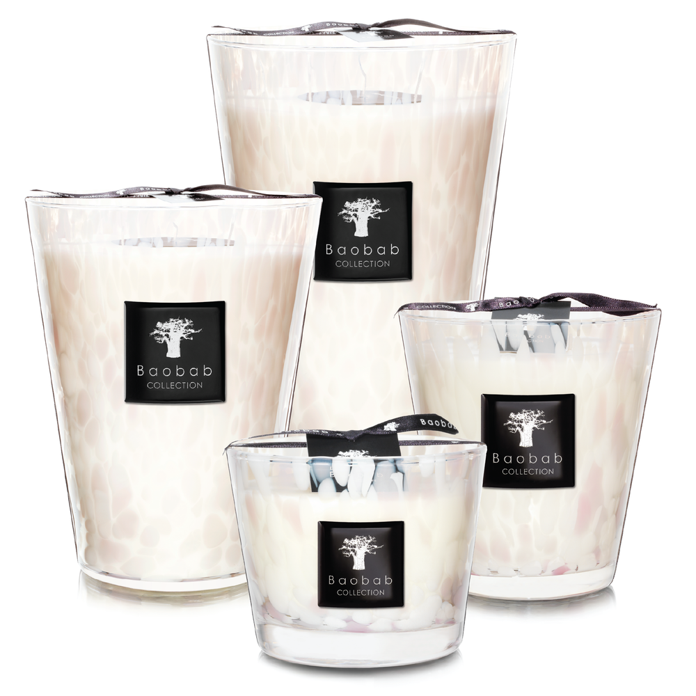 Orchid - Freesia - Musk. The delicate and floral scent of White Pearls, made up of white musk and jasmine, references the feminine quality of white pearls. For many centuries, white pearls have been seen as symbols of purity and love. Sprinkled with light pink and white fragments, the White Pearls scented candle is inspired by the perfection of the pearl, also known as “tears of the gods.”